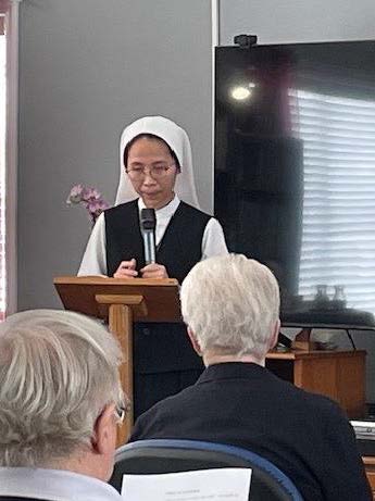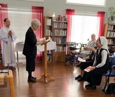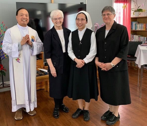 Today, in the presence of all the Sisters, our Sister Phan Hao accepted to renew her three vows of: Chastity, Poverty and Obedience during the Eucharistic Service of Jesus presided by Father Tuyen Vu of Prince Albert. The mass was animated by our musicians Sister ReAnne Letourneau and Sister Evelyn Nedelec. During Father’s inspirational homily, he congratulated Sister Hao and asked the Lord to bless her with many graces to live her vows with love and fidelity for the glory and for the service of the church. He wished her to continue trusting in Jesus and to follow Mary’s example.